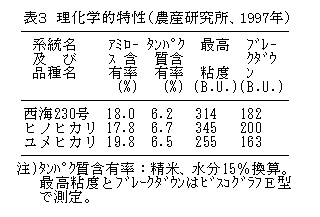 アミロース含有率やタンパク質含有率は低く、アミログラム特性の最高粘度は高く、ブレークダウンは大きく、米の理化学的特性は優れる(表3)。