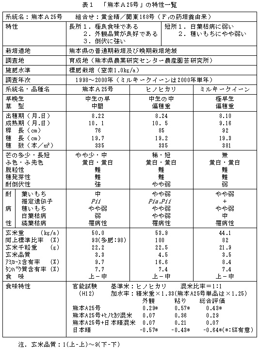 - 水稲「熊本A25号」は黄金晴/関東168号(後の「ミルキークイーン」)のF1を葯培養して育成した中生の低アミロース系統で、耐倒伏性が強く、良質、極良食味である。熊本県の平坦肥沃地の普通期作及びい草、たばこ後等晩期作への普及が見込まれる。