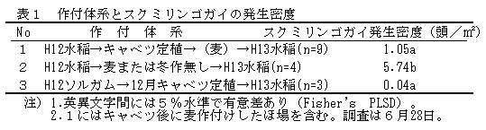 - 前作によって後作水稲でのスクミリンゴガイの発生密度が異なり、キャベツ後に水稲を作付けするとスクミリンゴガイの発生が水稲被害軽減水準の1頭/m2以下となり、実害がない(表1、図1)。