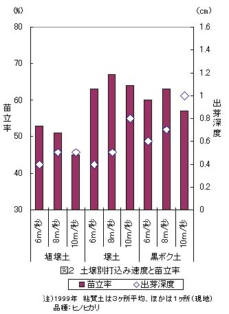 打込み速度が遅いと出芽深度が浅く、速度が早いと深くなり苗立率が低下するため、埴壌土、黒ボク土では8m/秒、壌土では8〜10m/秒が適当である。(図2)。