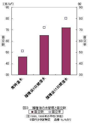 落水期間が長いほど苗立率は向上する。しかし落水期間が長いと漏水が著しくなるので8日間程度(出芽期または出芽揃期まで)行う。その際の苗立率は70%程度である(図3)。