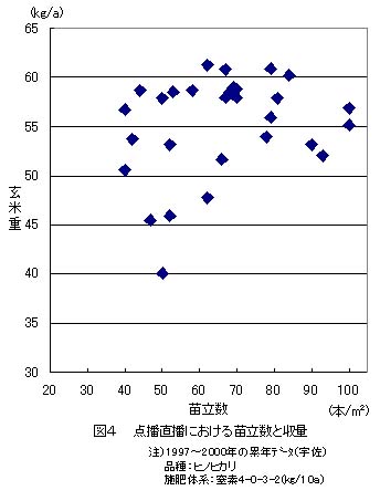 苗立数が、60〜80本/平方メートルのとき、55〜60kg/aの収量を確保できる。その際の播種量は苗立率との関係から乾籾2.7kg/10aである(図4)。