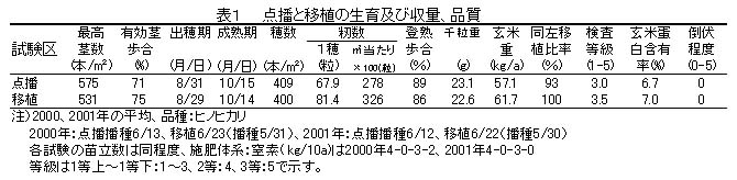 平坦地のヒノヒカリの点播直播は移植栽培に比べて最高茎数はやや多いが、無効分げつの増加により穂数は同程度となり、1穂籾数が少ないため収量はやや低下する。品質・食味は良い(表1)。