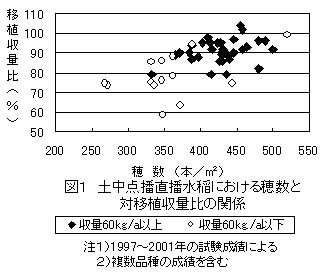 図1 土中点播直播水稲における穂数と対移植収量比の関係