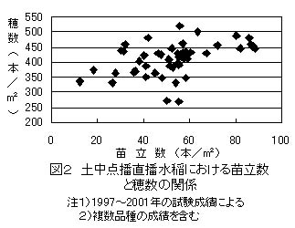 図2 土中点播直播水稲における苗立数と穂数の関係