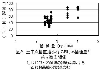 60〜80本/平方メートル程度の苗立数を確保するための播種量は3.5〜4kg/10aである(図3)。