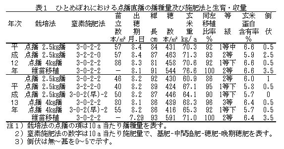 表1 ひとめぼれにおける点播直播の施肥法と生育・収量