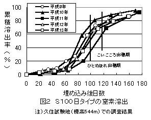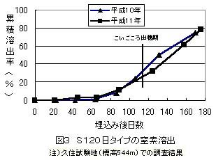 シグモイド型緩効性肥料を中山間地域で施用した場合、地温が低いため窒素溶出が遅く、累積窒素溶出率が80%となる日数は、80日タイプでは100〜120日、100日タイプでは100〜150日で年次による変動が大きく、120日タイプでは180日程度である(図1、図2、図3)。