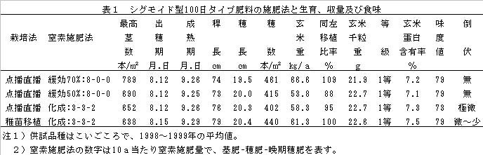 表1 シグモイド型100日タイプ肥料の施肥法と生育、収量及び食味