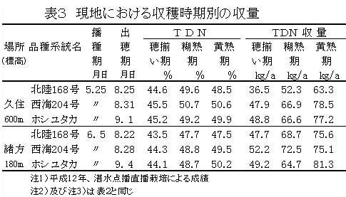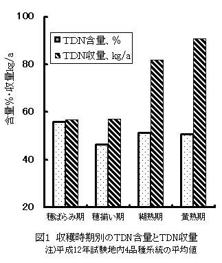 TDN収量は穂ばらみ期と穂揃い期は同程度で少なく、糊熟期、黄熟期と多くなり、黄熟期ではa当たり80〜90kg程度が得られる(表2、表3、図1)。