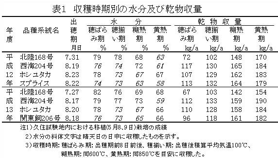 各品種系統とも乾物収量は収穫時期が遅いほど多くなり、黄熟期(積算気温約摂氏850度)ではa当たり150〜190kgが得られる(表1)。