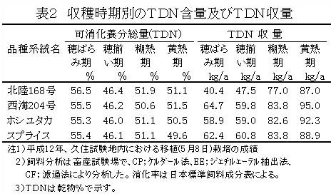 TDNは供試した品種系統間に差は無く、穂ばらみ期(出穂期前約8日)から黄熟期では、穂ばらみ期が55%程度と最も高く、穂揃い期(積算気温約摂氏100度)は45%程度と最も低い。糊熟期と黄熟期は同程度で50%程度である(表2、表3、図1)。