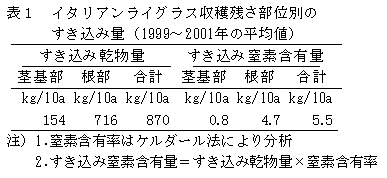表1 イタリアンライグラス収穫残さ部位別のすき込み量(1999〜2001年の平均値)