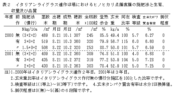 表2 イタリアンライグラス連作ほ場におけるヒノヒカリ点播直播の施肥法と生育、収量及び品質