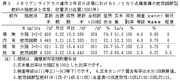 表3 イタリアンライグラス連作3年目のほ場におけるヒノヒカリ点播直播の肥効調節型肥料の施肥法と生育、収量及び品質(2001年)