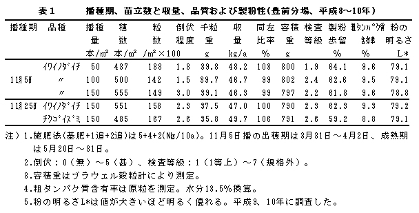 表1 播種期、苗立数と収量、品質および製粉性(豊前分場、平成8〜10年)