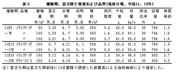 表2 播種期、苗立数と収量および品質(筑後分場、平成11、12年)