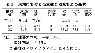 表3 現地における苗立数と収量および品質