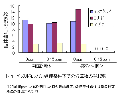 図1 ベンスルフロンメチル処理条件下での各草種の発根数
