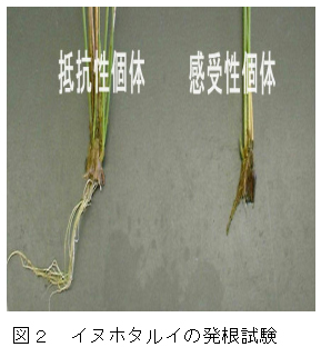 発根法及び酵素活性を利用した検定法による両者の検定試験から、SU剤を適期処理した水田に残草していたアメリカアゼナ、イヌホタルイ、コナギの3草種でSU剤抵抗性であることが確認された(図1、図2)。一部のほ場ではイヌホタルイとコナギの混在が認められた。