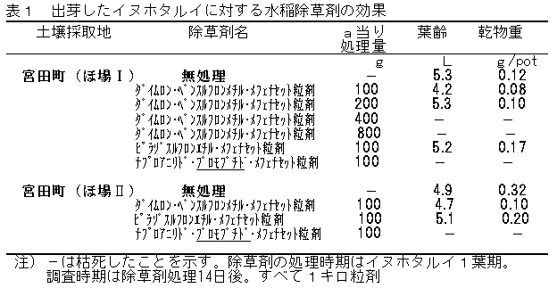 表1 出芽したイネホタルイに対する水稲除草剤の効果