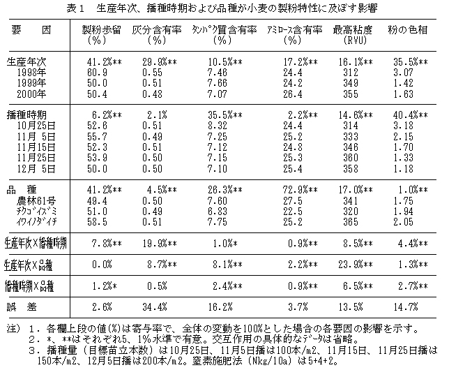 小麦の製粉特性は、生産年次、播種時期および品種により影響され、その影響度は製粉特性の項目ごとに異なる。製粉歩留と灰分含有率は生産年次に、タンパク質含有率は播種時期と品種に、アミロース含有率は品種に、粉の色相は播種時期に影響される。