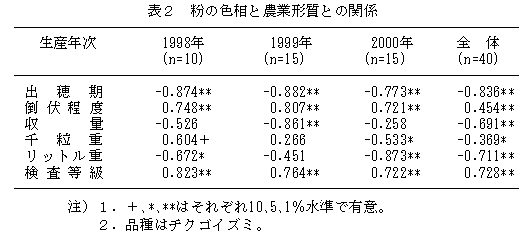 表2 粉の色相と農業形質との関係