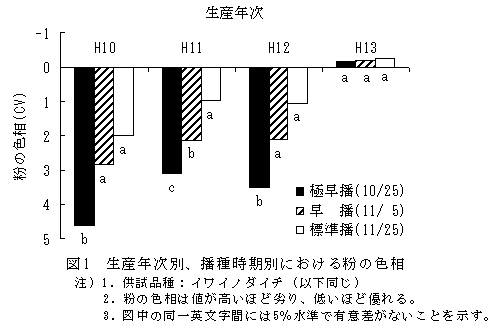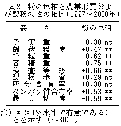表2 粉の色相と農業形質および製粉特性の相関(1997〜2000年)