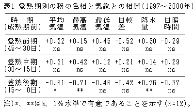 表1 登熟期別の粉の色相と気象との相関(1997〜2000年)