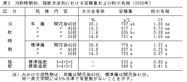 表3 刈取時期別、施肥方法別における容積重および粉の色相(2000年)