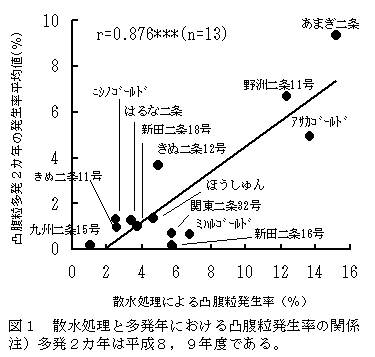 登熟後期に人工的に散水処理を行うと凸腹粒発生の品種間差が明確になる(表2)。その品種間差と多発年に自然条件下で得られた凸腹粒発生データとは有意な正の相関関係が認められる(図1)ことから、凸腹粒抵抗性系統の選抜に利用できる。