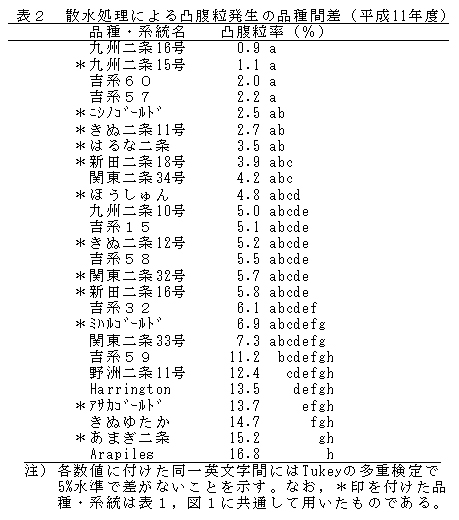 表2 散水処理による凸腹粒発生の品種間差(平成11年度)