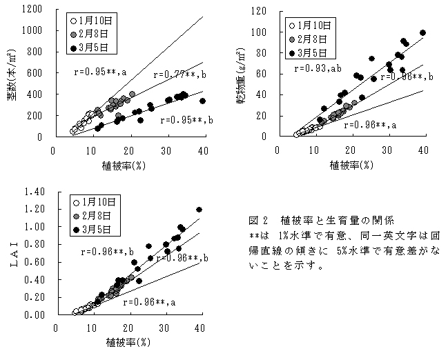 植被率は、茎数、地上部乾物重および葉面積指数(LAI)との間に高い正の相関関係が認められるので、植被率によって簡便で非破壊的に小麦の生育状況を診断することが可能である(図2)。