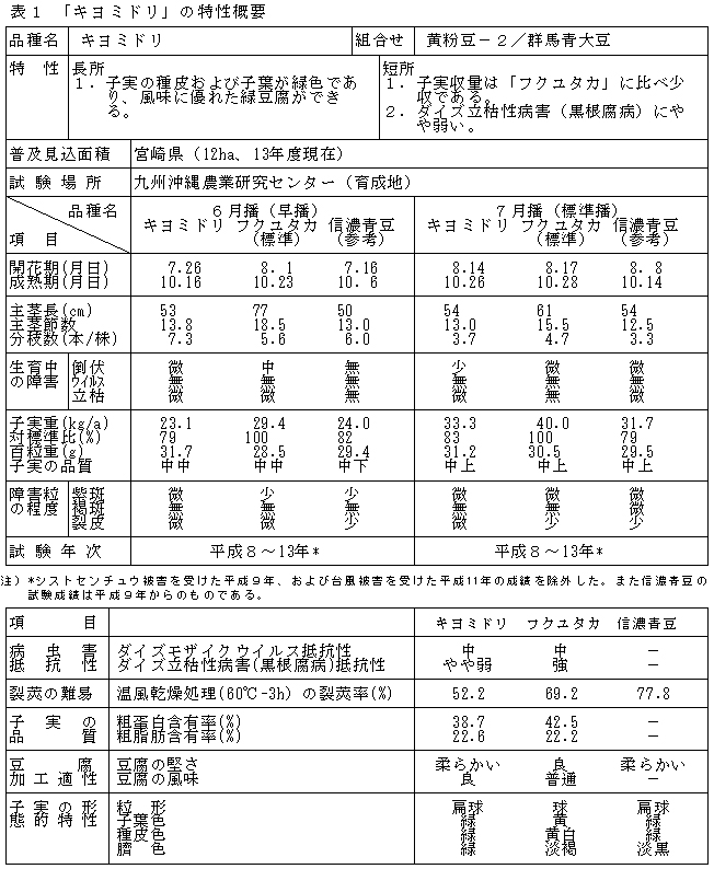 「キヨミドリ]の成熟期は「フクユタカ」に比べやや早く、生態型は“中間型”に属し、普及見込み地帯は九州地域である。
