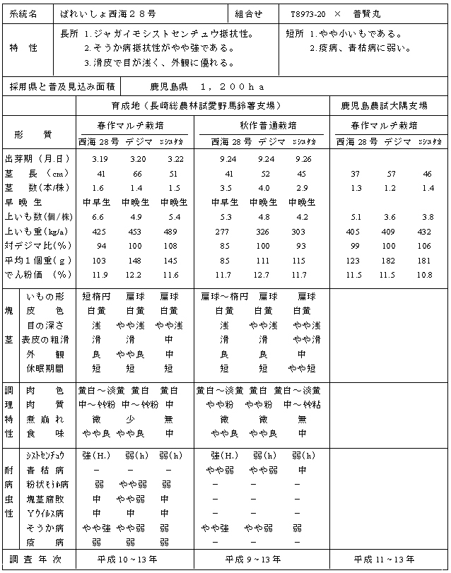 「西海28号」は、1994年春作に、そうか病に強い「T8973-20」を母、ジャガイモシストセンチュウ抵抗性を持ち、早生型で塊茎の早期肥大性に優れる「普賢丸」を父として交配し、翌年から育成・選抜してきた系統である。