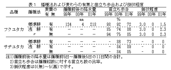 表1 播種法および麦わらの有無と苗立ち歩合および倒伏程度