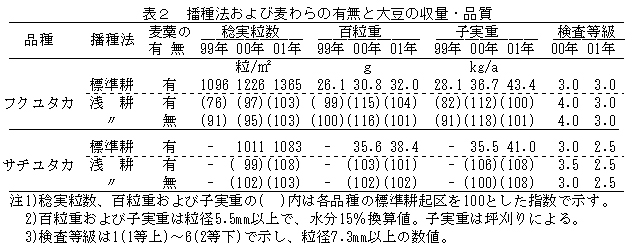表2 播種法および麦わらの有無と大豆の収量・品質