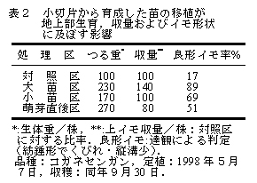 表2 小切片から育成した苗の移植が地上部生育,収量およびイモ形状に及ぼす影響