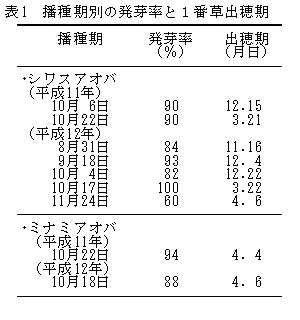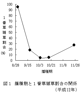 9月上旬以前に播種した場合、ヒエ、メヒシバ等の夏型雑草の発生により1番草の雑草割合が多くなり、極めて低収となる。また、11月中旬以降に播種した場合、発芽が悪く、ナズナ、ホトケノザ等の冬型雑草の発生により1番草の雑草割合がやや増加し、低収となる(図1、表1、表2)。