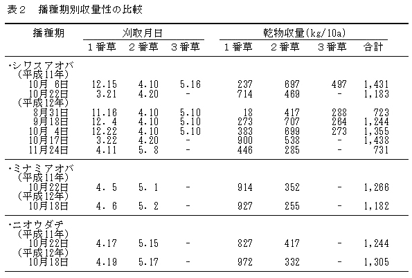 9月中旬から10月上旬までに播種すると1番草は年内に刈取適期である出穂期に到達するため年内1回、春2回の収穫が可能となる。合計乾物収量は「ニオウダチ」とほぼ同等である(表2)。
