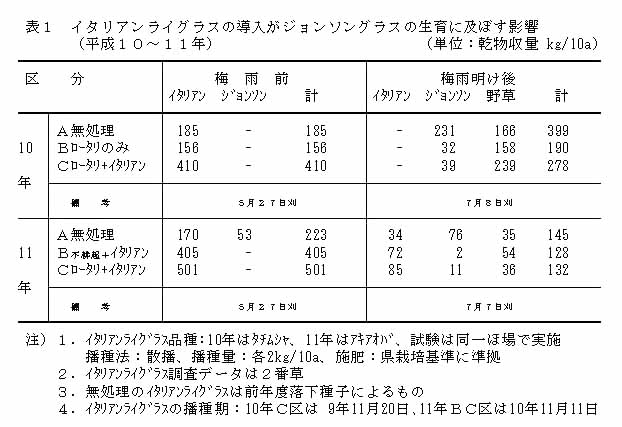 表1 イタリアンライグラスの導入がジョンソングラスの生育に及ぼす影響(平成10〜11年)