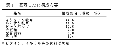 飼養方法では、表1に示した乾物1kg中TDN63.0%、CP17.1%のイタリアンライグラス乾草主体のTMRを基礎TMR飼料として給与した。基礎TMRに加え、市販の育成期用配合飼料およびルーサンペレットにて飼養し、基礎TMRは育成期間中飽食、配合飼料は一日一頭当たり2.5kgを上限とし、ルーサンペレットは生後4ヶ月齢から給与を開始し3.3kgを上限として給与した。