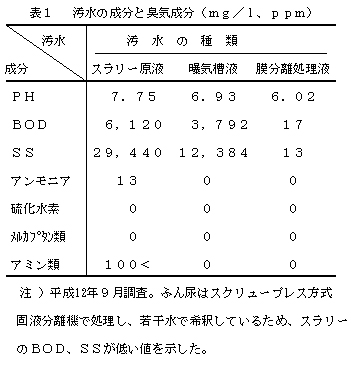 曝気装置と液中膜(穴径0.4μm)装置等を組合わせた前処理装置を用い、スラリーを前処理すると、アンモニアやアミン類等は処理過程で完全に脱臭され、また、BOD、SSは放流基準(BOD:日平均80ml/L,SS:同90ml/L)以下に、また、大腸菌も除去される(写真1、表1)。
