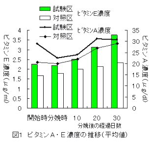 ホルスタイン種の乳牛に対し、分娩前7日〜分娩後30日間に、ビタミンA50万単位、ビタミンE1千単位を飼料に添加して給与すると、通常の飼料給与をした牛に比べ、血漿中ビタミンAおよびビタミンE濃度が高く推移する(図1)。