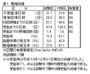 繁殖成績では、ビタミンA・Eの給与により胎盤停滞の発生が減少し、分娩後の子宮整復・発情回帰・初回発情等の日数が短縮される。受胎率は、夏期にもかかわらず71.4%(5/7)となる(表1、図2)。