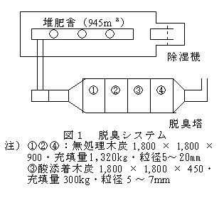 - 試験結果より母豚80頭の一貫、堆肥化容積129m3規模での木炭の寿命は1年間は可能と考えられる。建設費は、脱臭システムとして600万円(脱臭塔はステンレス仕様)またランニングコストは電気代として63万円/年、全ての木炭詰め替えに34万円必要でありる。