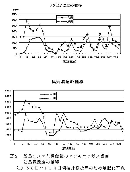 木炭を充填した実証用脱臭装置(図1)を設置して堆肥化施設(豚ぷん)での実証を行った結果、10ヶ月間の連続運転で排気中のアンモニアガス濃度は、50ppm前後で推移(図2)臭気濃度も400程度で推移(図2)しており拡散させれば問題のない濃度である