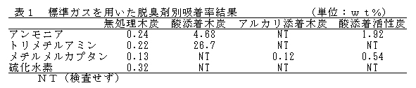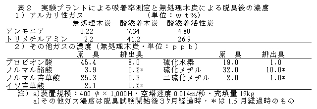 直径40cm高さ1m規模の実験用脱臭装置に木炭を充填し、悪臭ガスを通気させると、酸添着木炭がアンモニア、トリメチルアミンの吸着率が高い。また無処理木炭を用いた場合、低級脂肪酸、硫黄化合物の吸着率に良好な結果を示す。(表2)