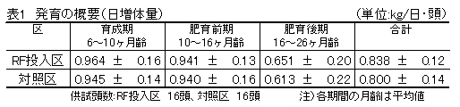 RFを投入することにより一日当たり増体量は対照区に対して大きい傾向にあり、終了時の体重も大きい傾向がみられた。(表1)