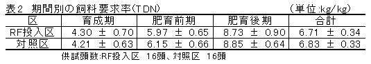 飼料要求率では、TDN当たりでRF投入区は対照区に対して優れる傾向を示し、特に肥育前期で有意に向上した。(表2)